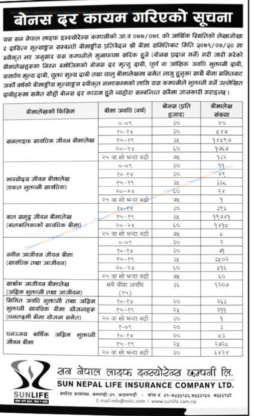 कम्पनीको मुनाफामा सरिक हुने गरी जारी गरिएको बीमालेखहरुमा बोनस दर मृत्यु दाबी,पुर्ण वा आंशिक अवधि भुक्तानी दाबी, समर्पण मुल्य दाबी, चुक्ता मुल्य दाबी तथा चालु बीमालेखमा समेत लागु हुनुका साथै बीमा समितिबाट अर्को वर्षको बीमाङ्कीय मूल्यांकन सार्वजनिक नभचएसम्मको लागि यो बोनसदर लागु भएको छ ।
