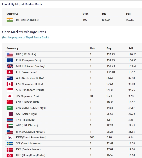 नेपाल राष्ट्र बैंकका अनुसार आज १ अमेरिकी डलरको खरिददर १२९ रुपैयाँ ७२ पैसामा र विक्रीदर १३० रुपैयाँ ३२ पैसामा नेपाली बजारमा खरिदविक्री भइरहेको छ ।