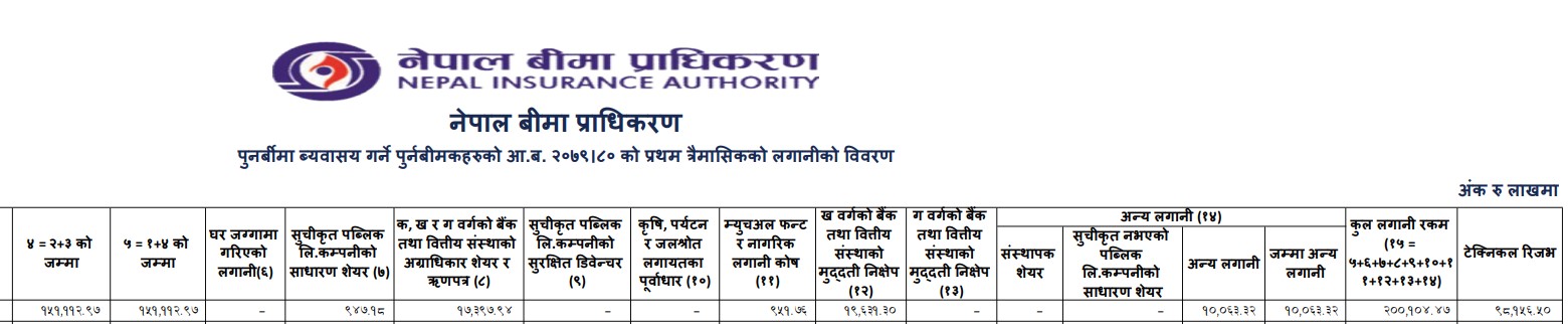 त्यस्तै, पुनर्बीमा कम्पनीले घरजग्गाको क्षेत्रमा, सूचीकृत कम्पनीको शेयरमा यस अवधिमा लगानी नगरेको बीमा समितिको तथ्यांकले देखाउँछ ।