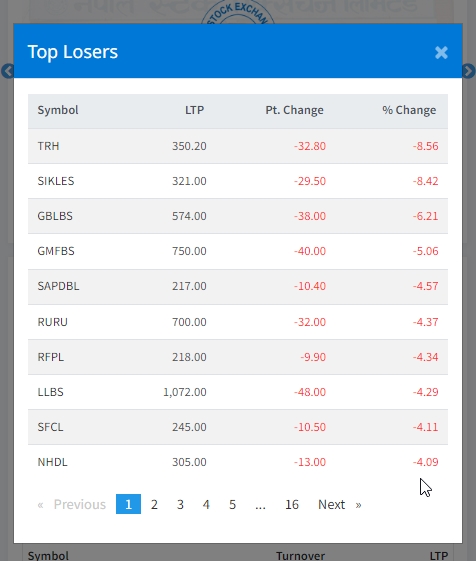 त्यस्तै, सिक्लेस हाइड्रोपावरको ८.४२, गरिमा विकास लघुवित्तको ६.२१, गनपति लघुवित्तको ५.०६ र सप्तकोशि विकास बैंकको ४.५७ प्रतिशतले शेयर मूल्य सर्वाधिक घटेको छ ।