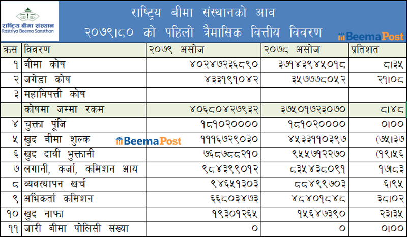 राष्ट्रिय बीमा संस्थानले चालु आवको तीन महिनामा एक अर्ब ११ करोड भन्दा बढि खुद बीमा शुल्क आम्दानी गर्न सफल भएको छ । संस्थानले यसै अवधीमा ७६ करोड ८७ लाख ८८ हजार २१० रुपैयाँ खुद दावी भुक्तानी गरेको छ । संस्थानले कर्जा लगानी, लगानी तथा बीमालेख धितोमा लगानी बापत प्राप्त आम्दानी १७.८३ प्रतिशतले बृद्धि भएको छ । गत आवमा ८३ करोड ५४ लाख रुपैयाँ आम्दानी गरेकोमा चालु आवको तीन महिनामा ९८ करोड ४३ लाख ९९ हजार २१ रुपैयाँ आम्दानी गर्न सफल भएको छ । त्यस्तै व्यवस्थापन खर्च बढेको छ । कम्पनीको व्यवस्थापन खर्च आठ करोड ८४ लाखबाट बढेर नौ करोड ४६ लाख नाघेको छ ।