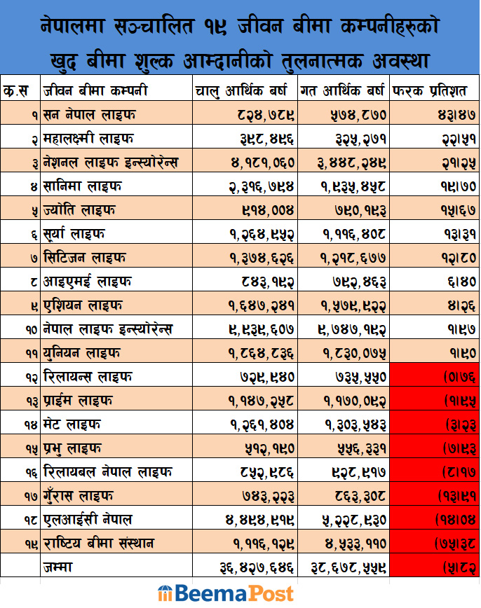 ज्योति लाइफले ९१ करोड रुपैयाँ, रिलायबल नेपाल लाइफले ८५ करोड रुपैयाँ, आइएमई लाइफले ८४ करोड रुपैयाँ, सन नेपाल लाइफले ८२ करोड रुपैयाँ, गुराँस लाइफले ७४ करोड रुपैयाँ, रिलायन्स लाइफले ७२ करोड रुपैयाँ, प्रभु लाइफले ५१ करोड रुपैयाँ र महालक्ष्मी लाइफले ३९ करोड रुपैयाँ खुद बीमाशुल्क आर्जन गर्न सफल भएका छन् ।