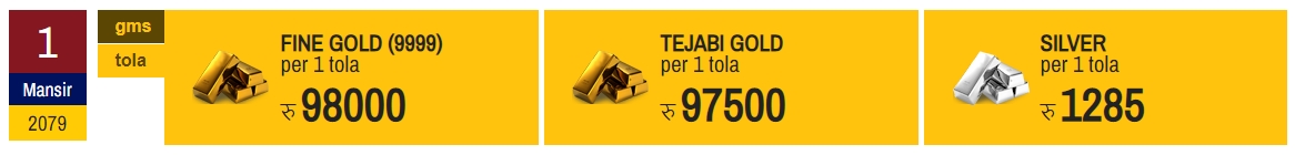 नेपाल सुनचाँदी व्यवसायी महासंघका अनुसार आज नेपाली बजारमा सुनको मूल्य प्रतितोला ९८ हजार रुपैयाँमा कायम भएको छ । त्यस्तै, चाँदी १ हजार २ सय ८५ रुपैयाँले कारोबार भैरहेको छ ।