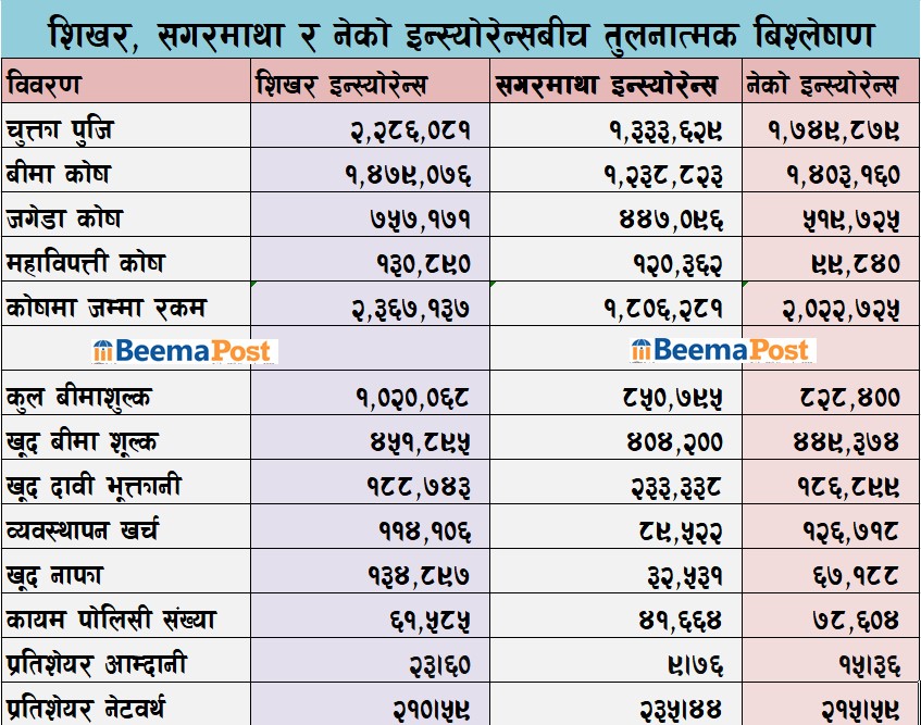 लिडर कम्पनी शिखर ,नेको इन्स्योरेन्स र सगरमाथा इन्स्योरेन्स कम्पनीबीच तुलनात्मक बिश्लेषण, कसको अवस्था कस्तो ?