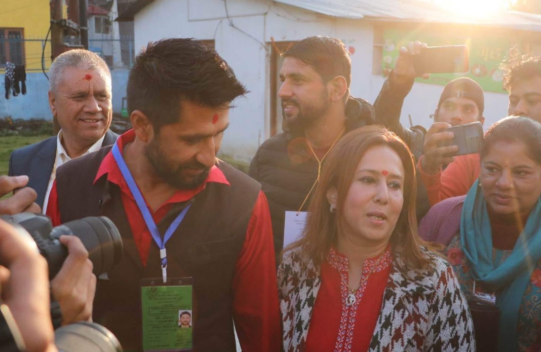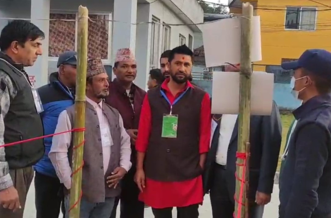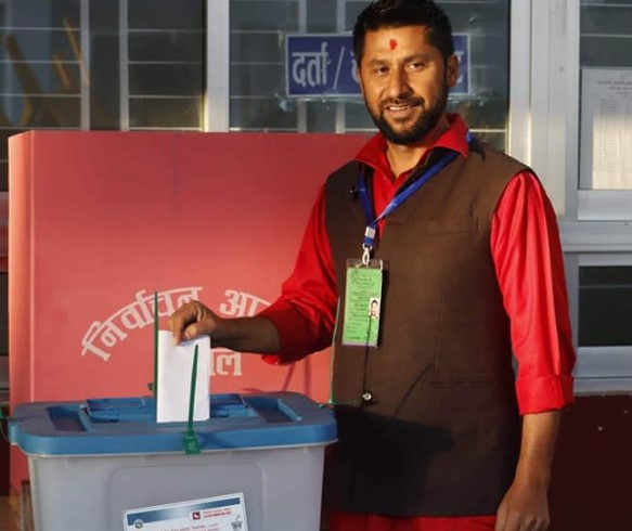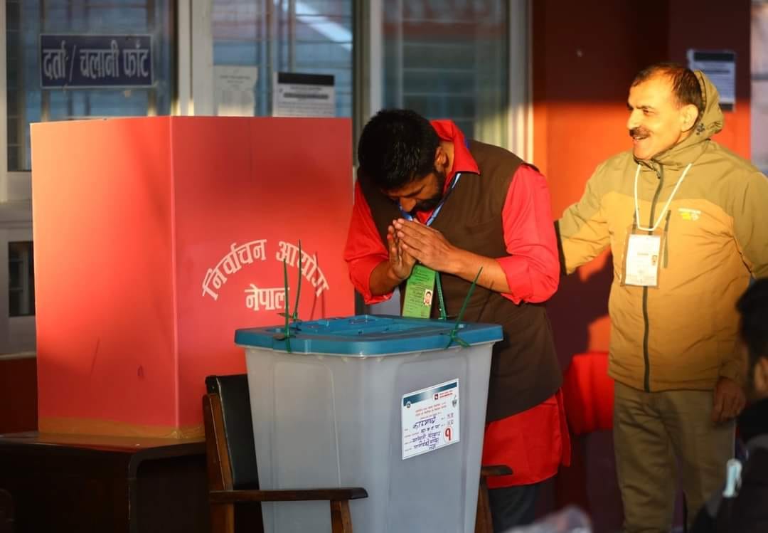 रवि लामिछानेले मत खसाल्दै मत खसालेको मतपेटिकालाई ढोगे