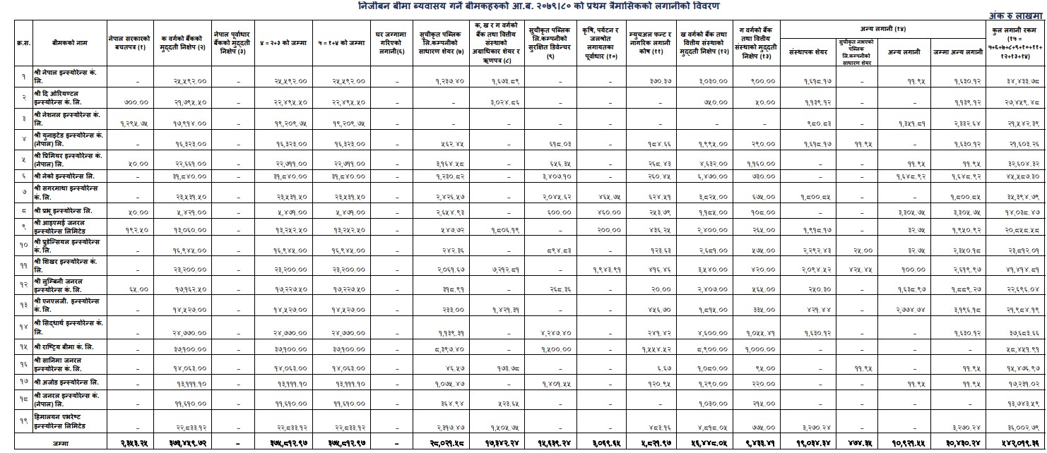 निर्जीवन बीमा कम्पनीहरुले लगानी ५४ अर्ब माथि, ८१ प्रतिशत रकम मुद्धतीमा निक्षेपमा, शेयर बजारमा कति ?