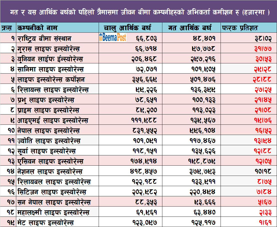 त्यस्तै, युनियन लाइफ इन्स्योरेन्सको अभिकर्ता कमीशन ३० प्रतिशत, सानिमा लाइफको २९ प्रतिशत, लाइफ इन्स्योरेन्स कर्पोशन (नेपाल)को २८ प्रतिशत, रिलायन्स लाइफको २७ प्रतिशत, प्रभु लाइफको २१ प्रतिशत, प्राइम लाइफको २१ प्रतिशत, आइएमई लाइफको १९ प्रतिशत, नेपाल लाइफको १६ प्रतिशत, ज्योति लाइफको १३ प्रतिशत, सूर्या लाइफको १२ प्रतिशत, एशियन लाइफको १२ प्रतिशत, रिलायबल नेपाल लाइफको ८ प्रतिशत, सिटिजन लाइफको ७ प्रतिशत, सन नेपाल लाइफको ५ प्रतिशत, महालक्ष्मी लाइफको २ प्रतिशत र सबैभन्दा कम मेट लाइफको १ प्रतिशतले घटेको छ।