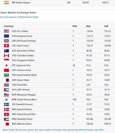 नेपाल राष्ट्र बैंकका अनुसार आज १ अमेरिकी डलरको खरिददर १३० रुपैयाँ ६५ पैसामा र विक्रीदर १३१ रुपैयाँ २५ पैसामा नेपाली बजारमा खरिदविक्री भइरहेको छ ।