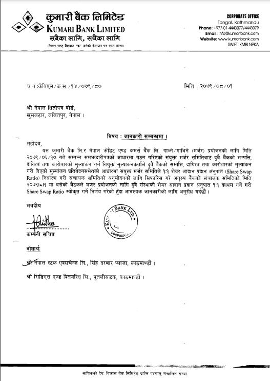 कुमारी बैंक र एनसीसी बैंकको सञ्चालक समितिको बैठकले अनुमोदन गरेअनुसार मंसिर १ गते बसेको सञ्चालक समितिका बैठकले प्रारम्भिक सम्झौता गर्दाकै स्वाप रेसीयो स्वीकृत गर्ने निर्णय गरेको जनाएको छ ।