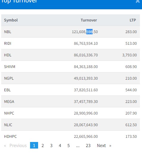 त्यस्तै, रिदी पावर कम्पनी, हिमालयन डिष्टिलरी, शिव्म सिमेन्ट्स, नाग्दी पावर, एभरेष्ट बैंक, मेगा बैंक, नेशनल हाईड्रोपावर, नेपाल लाइफ र हिमालm दोलखाको आज सर्वाधिक कारोबार भएको छ।