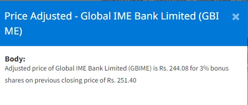 काठमाडौं । नेपाल स्टक एक्सचेञ्ज (नेप्से)ले ग्लोबल आइएमई बैंक लिमिटेडको शेयरमूल्य समायोजन गरेको छ । बैंकले लाभांश वितरण प्रयोजनका लागि मंसिर ७ गते बुकक्लोज गर्ने भएसँगै नेप्सेले सो कम्पनीको शेयरमूल्य समायोजन गरेको हो ।