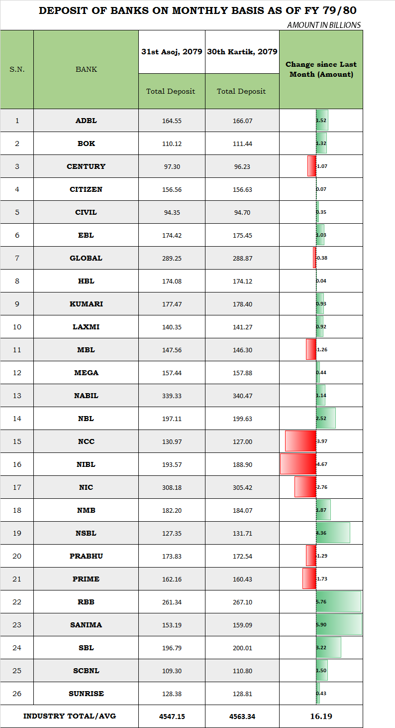 कात्तिकमा सानिका बैंकको निक्षेप संकलन सबैभन्दा धेरै ५ अर्ब ९० करोड रुपैयाँले बढाएको छ भने राष्ट्रिय वाणिज्य बैंकले पनि ५ अर्ब ७६ करोड रुपैयाँले बढाएको छ ।