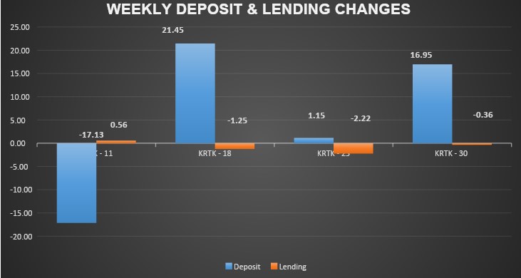 काठमाडौं । कात्तिक महिनामा वाणिज्य बैंकहरुको निक्षेप र कर्जा लगानी दुवै बढेको छ। नेपाल बैंकर्स एसोसिएसन (एनबीए)को तथ्यांकअनुसार कात्तिक महिनामा वाणिज्य बैंकहरुको निक्षेप १६ अर्ब रुपैयाँले बढेको छ। योसँगै कुल निक्षेप ४५ खर्ब ६३ अर्ब रुपैयाँ पुगेको छ। गत असोज मसान्तसम्म वाणिज्य बैंकहरुको कुल निक्षेप ४५ खर्ब ४७ अर्ब रुपैयाँ रहेको थियो।
