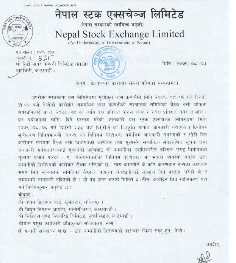 वम्पर लाभांश गरेको रिडी पावरको शेयर कारोबार रोक्का, नेप्से सोध्यो सपष्टीकरण