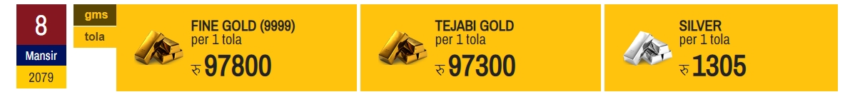 नेपाल सुनचाँदी व्यवसाय महासघंका अनुसार आज सुनको मूल्य प्रतितोला ९७ हजार ८०० रुपैयाँमा कायम भएको छ । त्यस्तै, आज चाँदीको मूल्य १ हजार ३ सय ५ रुपैयाँमा कारोवार भइरहेको छ ।