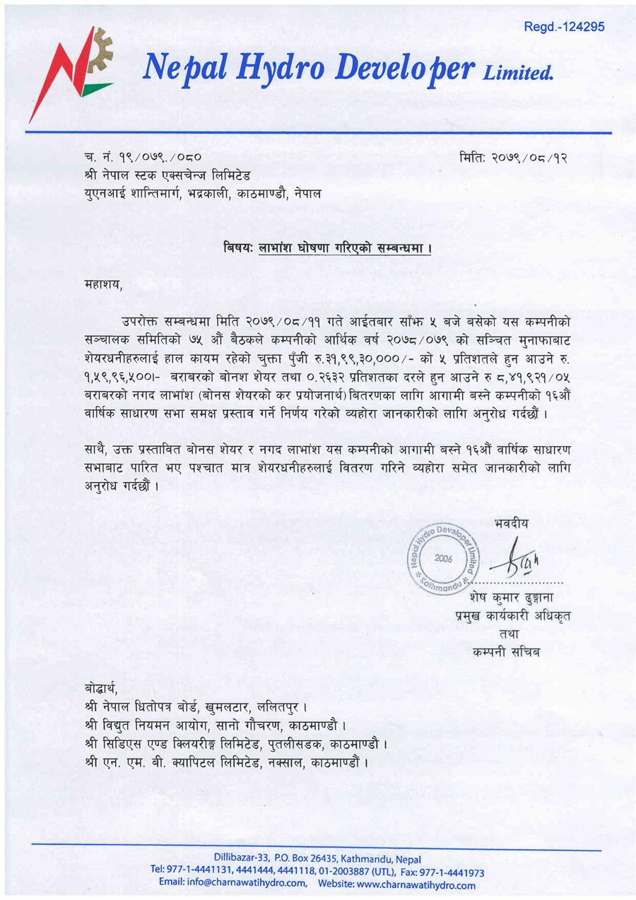 उक्त लाभांश कम्पनीको आगामी वार्षिक साधारण सभाले पारित गरेपछि शेयरधनीहरुमा वितरण हुनेछ ।