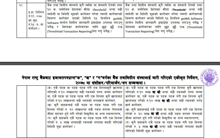 आज जारी निर्देशन नं ९ मा भनिएको छ, ‘ बैंक तथा वित्तीय संस्थाले अनिवार्य रुपमा वित्तीय माध्यमबाट गोएमएल प्रोडक्सन इन्भारोमेन्ट बाट मात्र सीमा तथा शंकास्पद कारोबार गतिविधि सम्बन्धी प्रतिवेदन पेश गर्नुपर्नेछ ।’ नयाँ व्यवस्था अनुसार एक दिनमा पटक पटक वा एकै पटक १० लाख भन्दा माथिको कारोबार सम्पत्ति शुद्धिकरण सम्बन्धी विषय बन्ने भएको छ ।