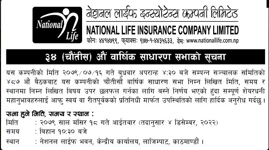 नेशनल लाइफको ३४ औं बार्षिक साधारणसभा आज हुँदै, १५ प्रतिशत बोनस शेयर पारित गर्ने प्रस्ताव