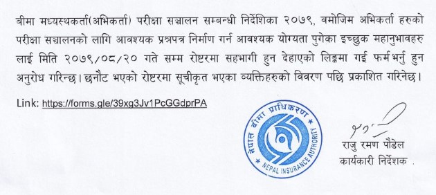 प्राधिकरणले बीमा मध्यस्कर्ता (अभिकर्ता) परिक्षा संचालन सम्बन्धी निर्देशिका २०७९, बमोजिम अभिकर्ताहरुको परिक्षा संचालनको लागि आवश्यक प्रश्नपत्र निमार्ण गर्न रोष्टरमा आह्वान गरेको छ ।