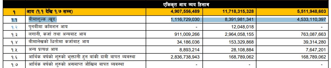 त्यस्तै, नियामक निकाय बीमा प्राधिकरणमा बुझाएको विवरणमा समेत दुई अर्ब ९४ करोड रुपैयाँ लुकाइएको छ । संस्थानले प्रकाशन गरेको पहिलो त्रैमासिक वित्तीय विवरणमा खुद बीमा शुल्क आम्दानी एक अर्ब १६ करोड ७२ लाख २९ हजार ३० रुपैयाँ खुद बीमा शुल्क आम्दानी गरिएको देखाइएको छ ।