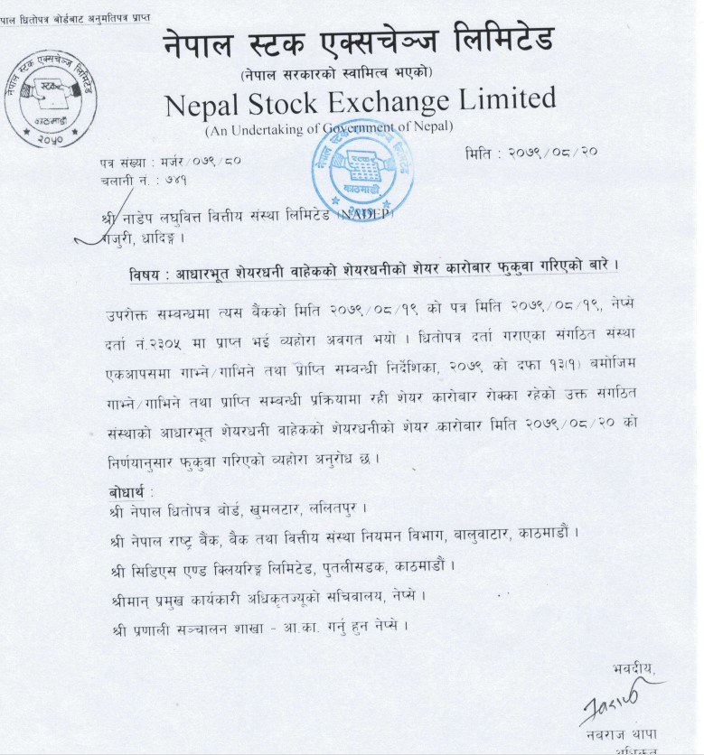 करिब २ बर्षपछि नाडेप लघुवित्तको शेयर कारोबार फुकुवा