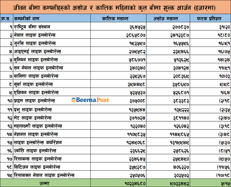 कात्तिक महिनामा आधा जीवन बीमा कम्पनीको ब्यवसाय घट्यो, कुनको कति ? (तथ्याङ्कसहित)