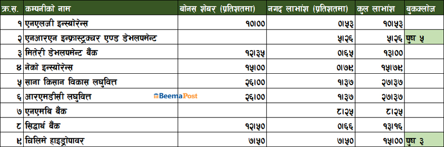९ मध्ये पनि एनआरएन इन्फ्रास्ट्रक्चर र एनएमबि बैंकले बोनस नदिई नगद लाभांश मात्रै प्रस्ताव गरेका छन् भने बाँकी सबै कम्पनीले बोनस शेयरका साथै नगद लाभांश समेत प्रस्ताव गरेका छन् ।