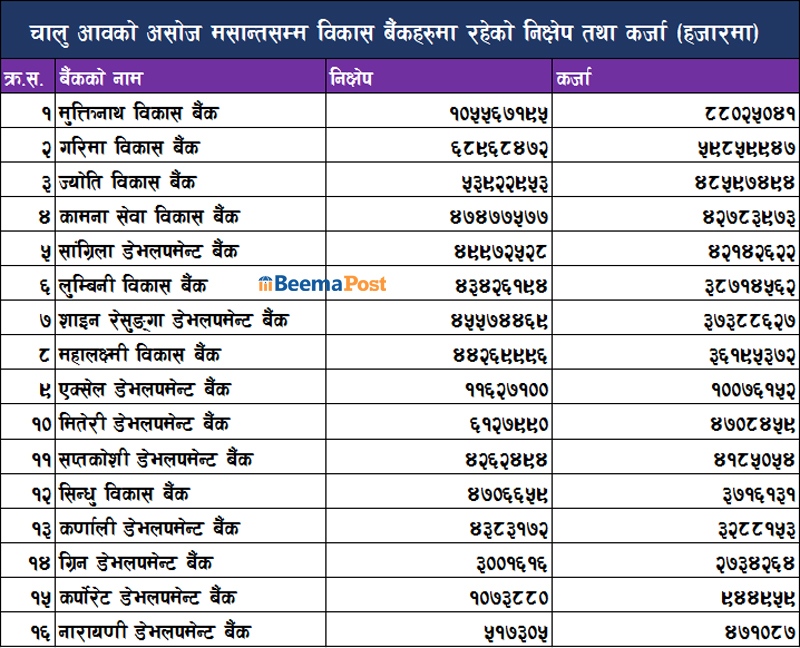 त्यस्तै, कर्जा परिचालनमा ज्योति विकास बैंकको ४८ अर्ब, कामना सेवा विकास बैंकको ४२ अर्ब ७८ करोड, सांग्रिला डेभलपमेन्ट बैंकको ४२ अर्ब १४ करोड, लुम्बिनी विकास बैंकको ३७ अर्ब ७१ करोड, शाइन रेसुङ्गा डेभलपमेन्ट बैंकको ३७ अर्ब ३८ करोड, महालक्ष्मी विकास बैंकको ३६ अर्ब १९ करोड, एक्सेल डेभलपमेन्ट बैंकको १० अर्ब ७ करोड, मितेरी डेभलपमेन्ट बैंकको ४ अर्ब ७० करोड, सप्तकोशी डेभलपमेन्ट बैंकको ४ अर्ब १८ करोड, सिन्धु विकास बैंकको ३ अर्ब ७१ करोड, कर्णाली डेभलपमेन्ट बैंकको ३ अर्ब २८ करोड, ग्रिन डेभलपमेन्ट बैंकको २ अर्ब ७३ करोड, कर्पोरेट डेभलपमेन्ट बैंकको ९४ करोड र नारायणी डेभलपमेन्ट बैंकको ४७ करोड रुपैयाँमाथि पुगेको छ ।