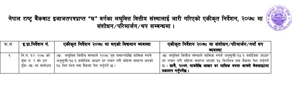 यसअघि राष्ट्र बैंकको एकीकृत निर्देशमा लघुवित्त वित्तीय संस्थाहरुले पुष मसान्तदेखि मासिक रुपले आधार दर तयार गरी महिना समाप्त भएको १५ दिनभित्र केन्द्रीय बैंकमा पेश गनुपर्ने प्रावधान थियो । केन्द्रीय बैंकले संशोधन गरेको एकीकृत निर्देशमा वित्तीय संस्थाहरुले आधार दर अब मासिक रुपमा आफ्नो वेबसाइटमा प्रकाशन गर्नुपर्ने समावेश गरेको हो ।