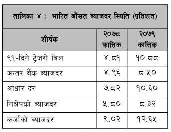 त्यस्तै बैंकहरुको आधार दर समेत ७.८२ प्रतिशतबाट बढेर १०.६० प्रतिशत पुगेको छ । साथै अन्तर बैंक ब्याजदर ४.९६ प्रतिशतबाट बढेर ८.५० प्रतिशत पुगेको छ भने ९१ दिने ट्रेजरी बिलको ब्याजदर ४.८१ प्रतिशतबाट बढेर १०.८८ प्रतिशत पुगेको छ ।