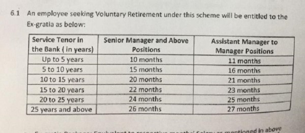 बैंकमा ५ वर्षसम्म काम गरेका एसिस्टेन्ट म्यानेजरदेखि म्यानेजरसम्मका कर्मचारीले स्वेच्छिक अवकाश रोज्दा ११ महिनाको तलब पाउने छ । यस्तै, ५ वर्षसम्म काम गरेका सिनियर म्यानेजरदेखि माथीका कर्मचारी स्वेच्छिक अवकाशमा जाँदा १० महिनाको तलब पाउने छ ।