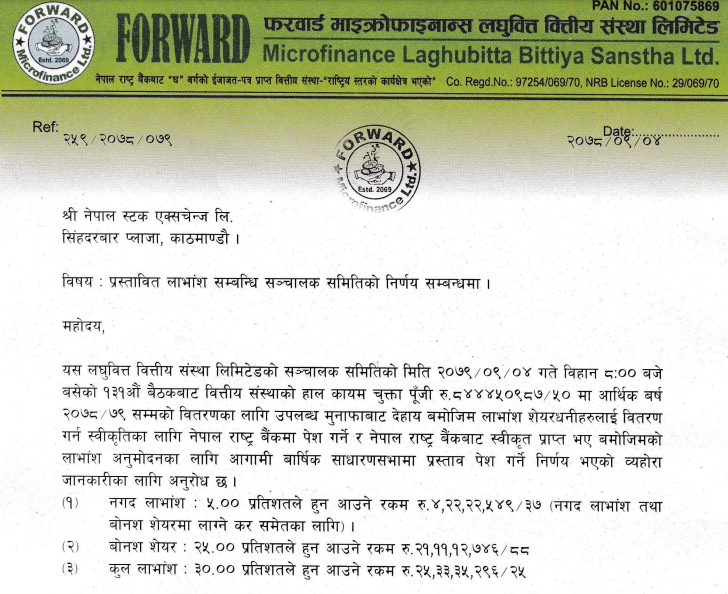 फरवार्ड माइक्रोफाइनान्सको लाभांश घोषणा, बोनस र नगद कति ?
