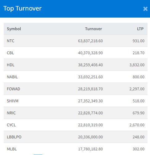 त्यस्तै, सिभिल बैंकको ४ करोड ३ लाख, हिमालयन डिष्टिलरीको ३ करोड ८२ लाख, नबिल बैंकको ३ करोड ३६ लाख र फरवार्ड माइक्रोफाइनान्सको २ करोड ८२ लाख रुपैयाँमाथिको कारोबार भएको छ ।