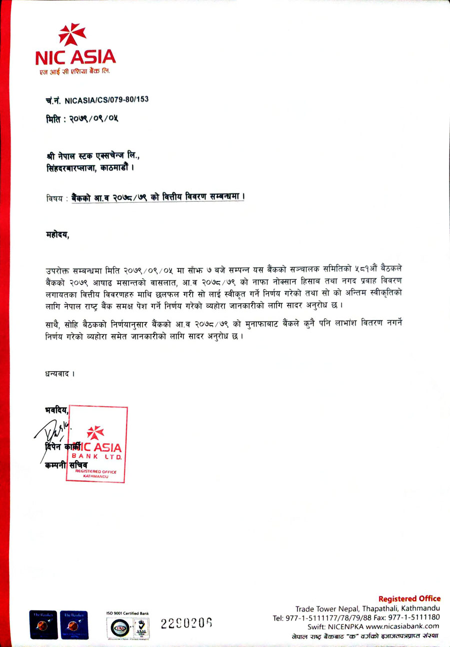 बैंकको पुष ५ गते बसेको संचालक समितिको बैठकले आव २०७८।७९ को मुनाफाबाट शेयरधनीहरुलाई कुनै पनि लाभांश नबाड्ने निर्णय गरेको हो । साथै बैंकले आव २०७८।७९ को वित्तीय विवरणहरुमाथि छलफल गरी सो लाई स्वीकृत गर्ने निर्णय गरेको तथा सो को अन्तिम स्वीकृतिको लागि नेपाल राष्ट्र बैंक समक्ष पेश गर्ने निर्णय गरेको छ ।