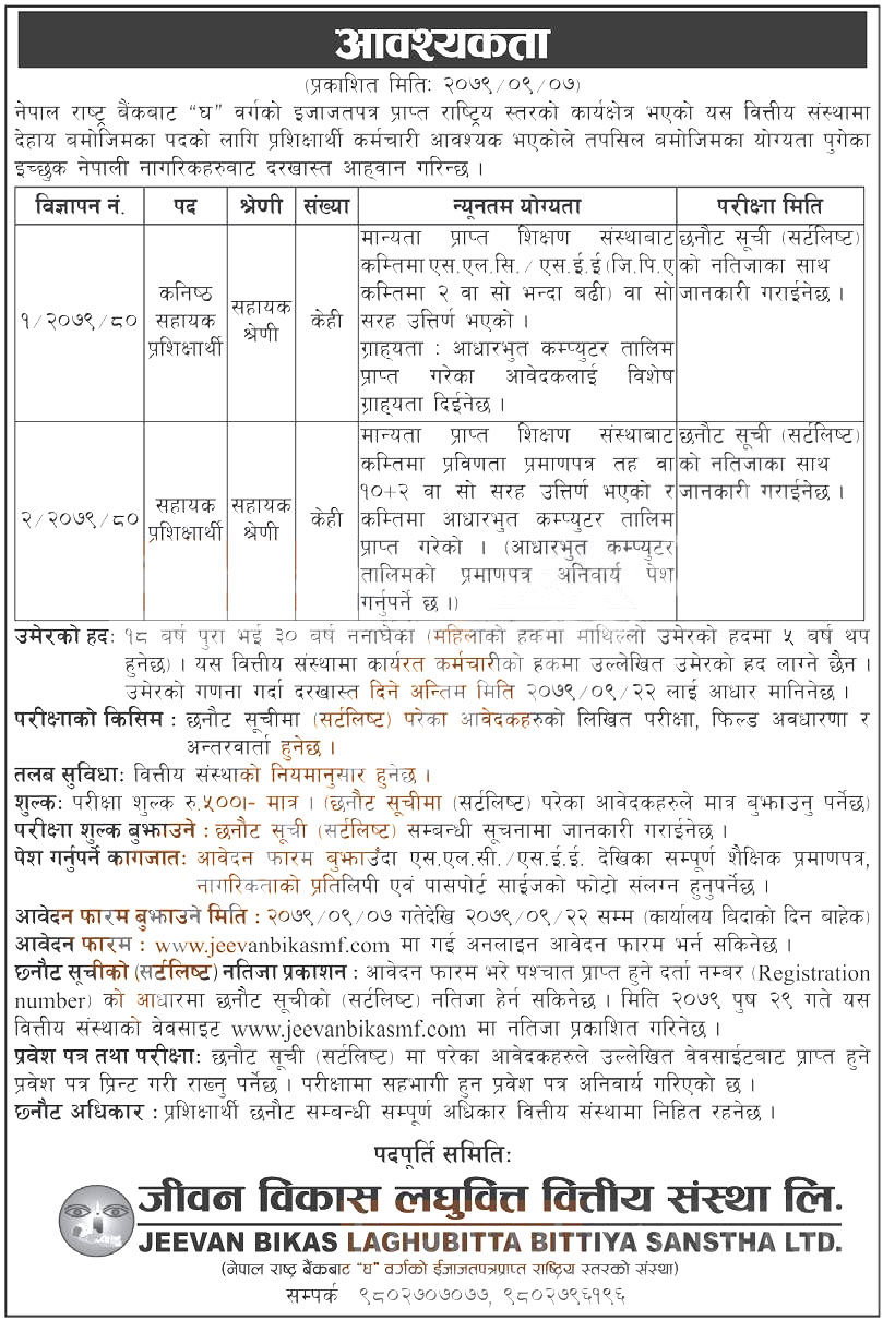 योग्यता पुगेका इच्छुक ब्यक्तिले पुष २२ गतेसम्म कम्पनीको वेबसाइट https://www.jeevanbikas.org.np/career/ मार्फत दरखास्त दिन सक्नेछन् ।