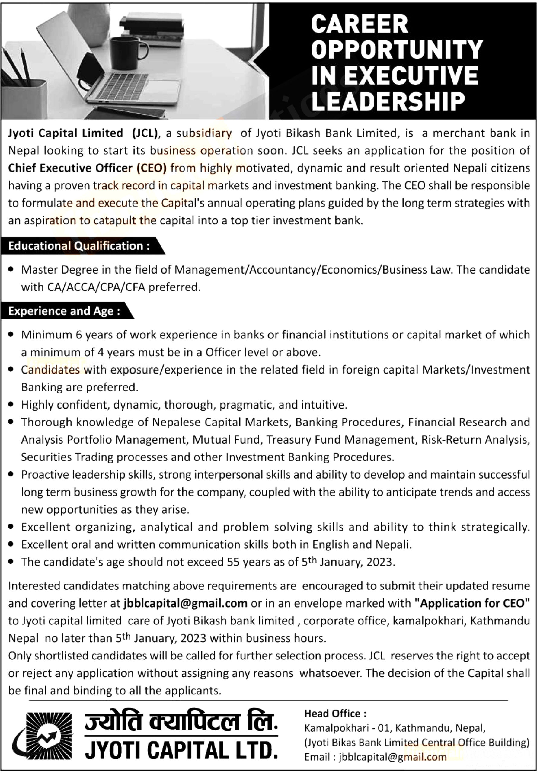 क्यापिटलले प्रमुख कार्यकारी पदमा १ जना कर्मचारी माग गरेको छ । सो पदहरुमा आवेदन दिनको लागि आवेदकले मान्यताप्राप्त शैक्षिक सस्थाबाट स्नाकोत्तर तह उत्तिर्ण गरेको हुनुपर्ने छ ।