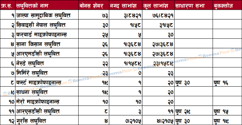 एक दर्जन लघुवित्त संस्थाद्धारा लाभांश घोषणा, कुनको कति ? (तालिकासहित)