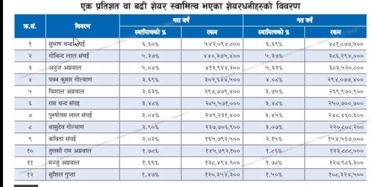 कम्पनीमा कविता संघईको २ दशमलव २ प्रतिशतले १६ करोड ५७ लाख रुपैयाँको शेयर स्वामित्व रहेको छ । त्यस्तै, तुलसी राम अग्रवालको १ दशमलव ७८ प्रतिशतले १४ करोड ५७ लाख रुपैयाँको शेयर स्वामित्व रहेको छ ।
