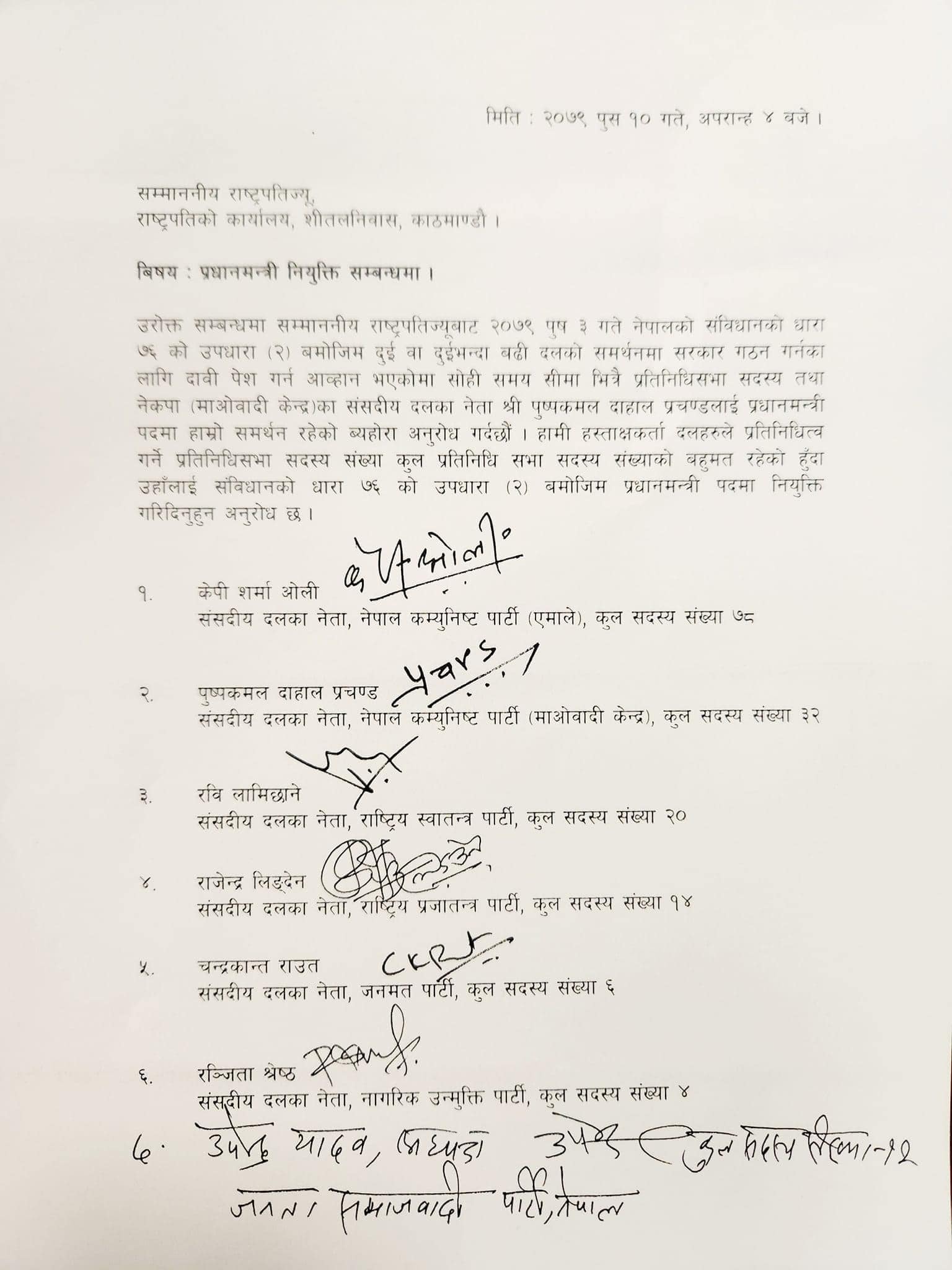 नेकपा माओवादी केन्द्रका अध्यक्ष प्रचण्ड माओवादीको ३२, एमालेको ७८, स्वतन्त्र पार्टीको २०, राप्रपाको १४, जसपाको १२, जनमत पार्टी ६ र नागरिक उन्मुक्ति पार्टीको ४ सहित कूल १६९ सांसदको समर्थनमा प्रधानमन्त्री बन्न लागेका हुन् ।