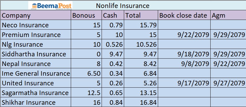 सूचिकृत अधिकांश कम्पनीहरुले आर्थिक वर्ष २०७७।७८ को लागि लाभांश घोषणा गरिसकेका छन् भने कतिपय कम्पनीहरु प्रस्ताव गर्ने तयारीमा छन् ।९ कम्पानीहरुले पुस मसान्तसम्मको लागि बार्षिक साधारणसभा घोषणा गरिसकेका छन् । जसमध्ये चारवटाले बुक क्लोजको मिति घोषणा गरिसकेका छन् ।दोस्रो बजारमा कारोबार भईरहेका प्रिमियम इन्स्योरेन्स, सिद्धार्थ इन्स्योरेन्स नेपाल इन्स्योरेन्स र युनाईटेड इन्स्योरेन्सको शेयर किन्ने लगानीकर्ताले अझै शेयर पाउनेछन् ।