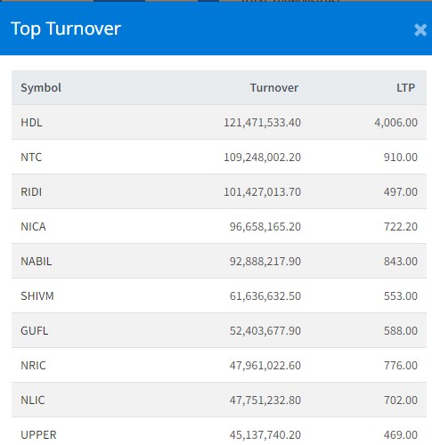 आज सर्वाधिक हिमालयन डिष्टिलरीको १२ करोड १४ लाख रुपैयाँमाथिको कारोबार भएको छ । त्यस्तै, नेपाल टेलिकमको १० करोड ९२ लाख, रिडी हाइड्रोपावरको १० करोड १४ लाख, एनआइसी एशियाको ९ करोड ६६ लाख र नबिल बैंकको ९ करोड २८ लाख रुपैयाँमाथिको कारोबार भएको छ ।