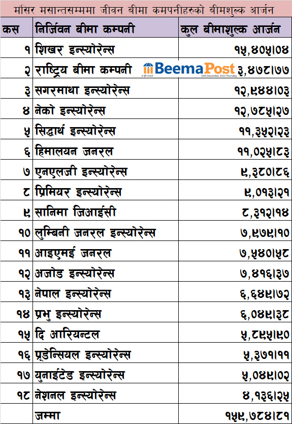 निर्जिवन बीमा कम्पनीहरुको कुल बीमाशुल्क आर्जन पौने १६ अर्ब रुपैयाँ, कुनको कति ? (तथ्यांक सहित)