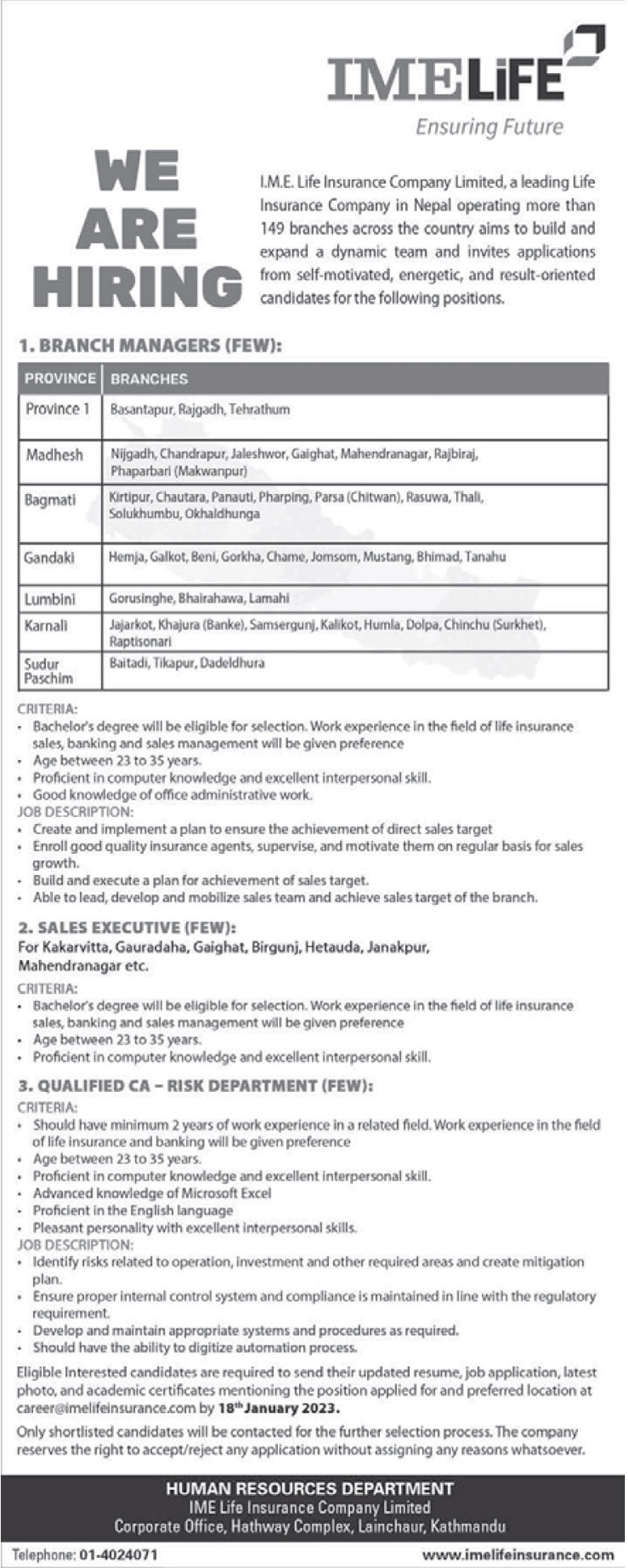 आइएमई लाइफ इन्स्योरेन्सद्धारा ४२ शाखा प्रमुख माग, कति चाहिन्छ शैक्षिक योग्यता ?