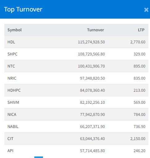 त्यस्तै, सानिमा माई हाइड्रोपावरको १० करोड ८७ लाख, नेपाल टेलिकमको १० करोड ४ लाख, नेपाल पुनर्बीमा कम्पनीको ९ करोड ७३ लाख र हिमाल दोलखा हाइड्रोपावरको ८ करोड ४० लाख रुपैयाँमाथिको कारोबार भएको छ ।