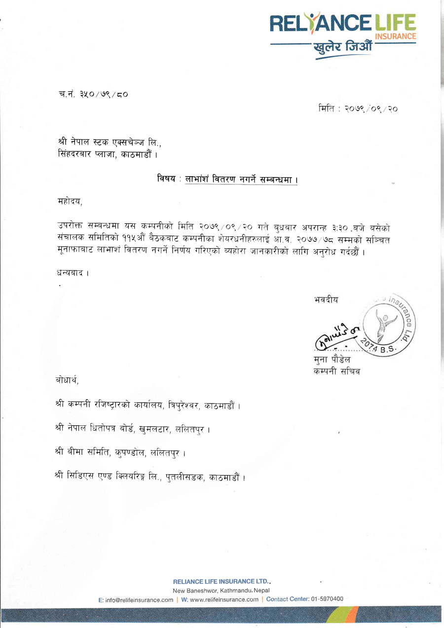 रिलायन्स लाइफ इन्स्योरेन्सद्धारा लाभांश नबाड्ने घोषणा
