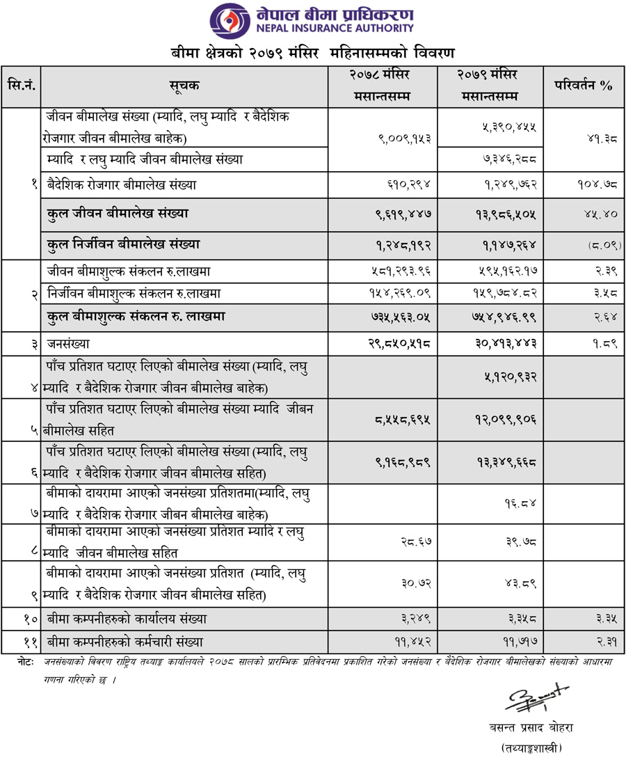 साथै २०७९ को मंसिर महिनासम्म जीवन बीमा कम्पनीहरुको कुल बीमालेखको संख्या ४५.४० प्रतिशतले बढेर १ करोड ३९ लाख ८६ हजार ५०५ पुगेको छ भने निर्जिवन बीमा कम्पनीहरुको कुल बीमालेखको संख्या ४५.४० प्रतिशतले बढेर ११ लाख ४७ हजार २४६ पुगेको छ ।