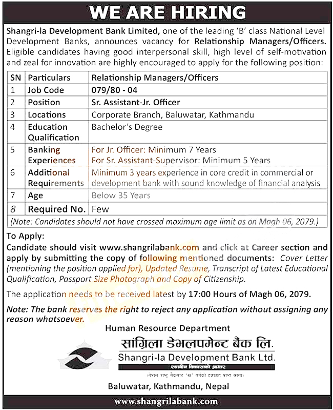 इच्छुक उम्मेदवारले संस्थाको वेवसाईट https://idocs.shangrilabank.com/career/ मार्फत आवेदन दिन सक्नेछन् ।