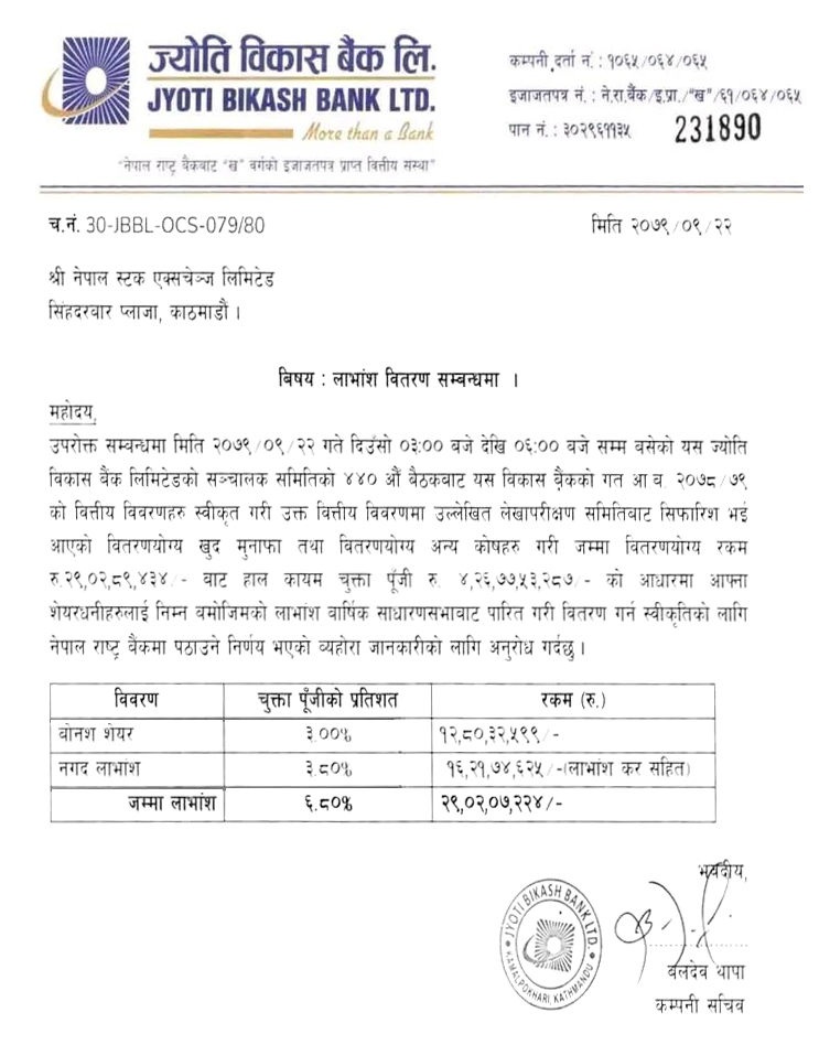 ज्योति विकास बैंकको लाभांश घोषणा, बोनस भन्दा नगद धेरै