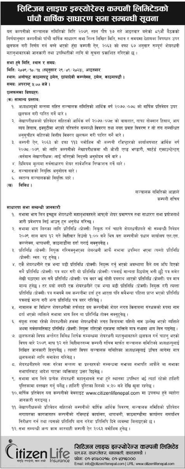 सिटिजन लाइफ इन्स्योरेन्सले प्रिमियममा आइपीओ निष्काशन गर्ने, डाक्यो साधारण सभा