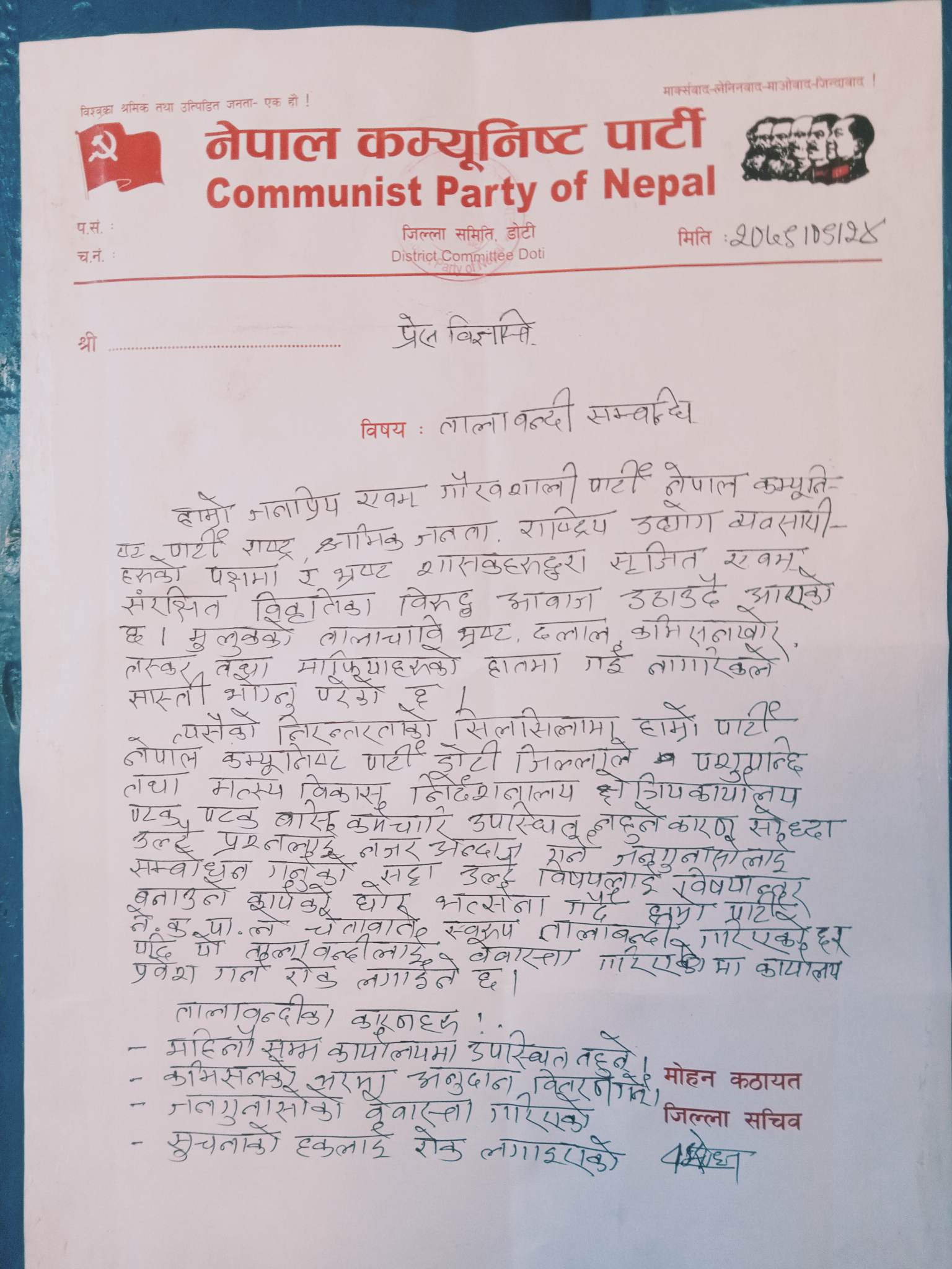 नेपाल कम्युनिष्ट पार्टी, जिल्ला समिति डोटीले आज एक बिज्ञप्ति जारी गर्दै डोटीस्थित पशुपन्छी तथा मत्स्य विकास निर्देशनालय, राजपुर डोटीमा तालावन्दी गरेको हो ।